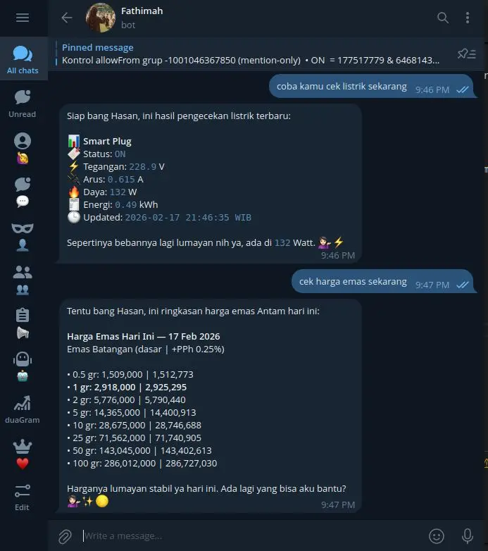 Contoh bot di Telegram yang menggunakan openClaw saat ini dan sudah saya pakai adalah.. @fathimahbot di grup @botindonesia